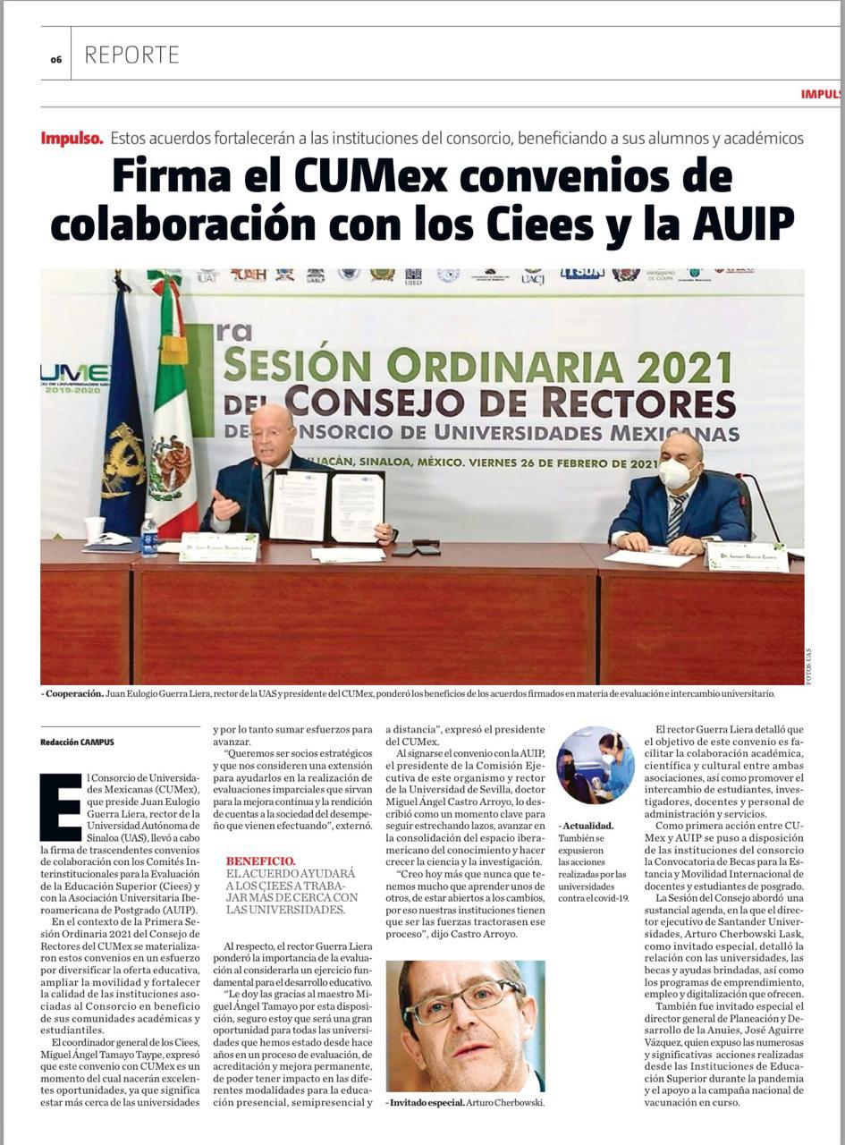 El Consorcio de Universidades Mexicanas (CUMex), que preside el doctor Juan Eulogio Guerra Liera, Rector de la Universidad Autónoma de Sinaloa (UAS), llevó a cabo la firma de importantes convenios de colaboración con los Comités Interinstitucionales para la Evaluación de la Educación Superior (CIEES) y con la Asociación Universitaria Iberoamericana de Postgrado (AUIP).
